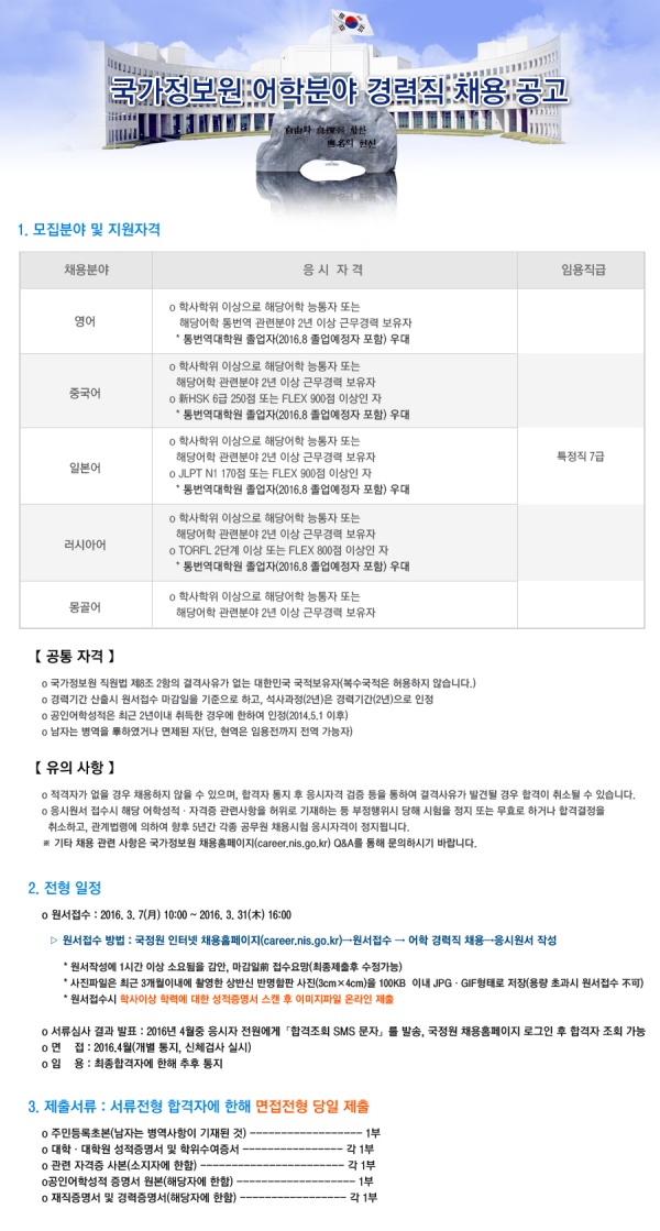 [국정원채용안내] 2016년도 국가정보원 어학분야 경력직 채용 공고[2016.03.07~2016.03.31]