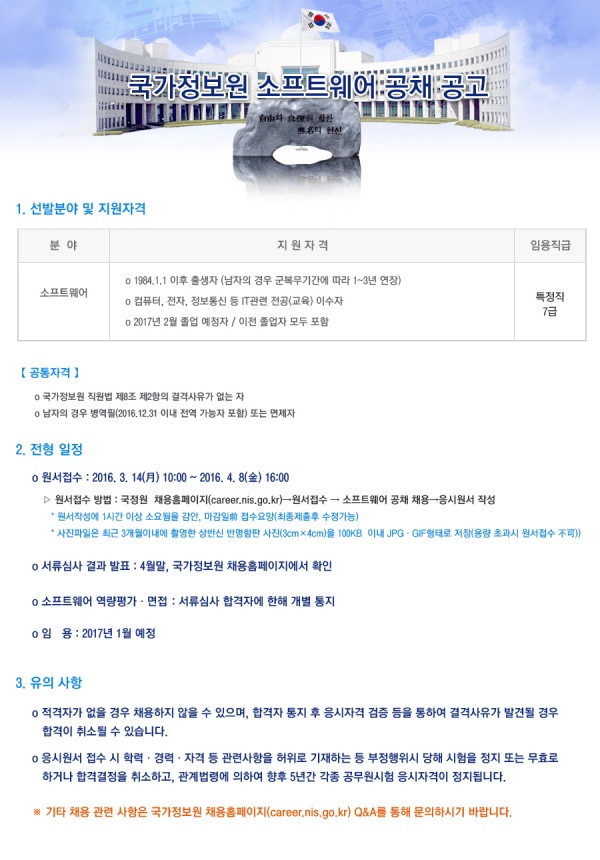[국정원채용안내] 2016년도 소프트웨어분야 채용 공고[2016.03.14 10:00~2016.04.08 16:00]