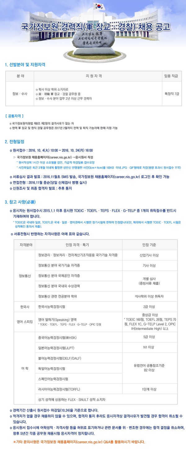 [국정원채용안내] 2016년도 경력직(군장교·경찰) 채용 공고[원서접수:2016.10.04 10:00~2016.10.24 16:00]