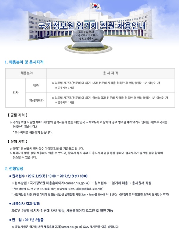 [국정원채용안내] 2017년도 임기제 의사(내과ㆍ영상의학과) 채용 공고[원서접수:2017.1.17~2017.2.15]