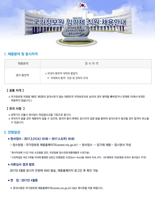 [국정원채용안내] 2017년도 임기제(영어 통번역) 채용 공고[원서접수:2017.3.21~2017.4.3]