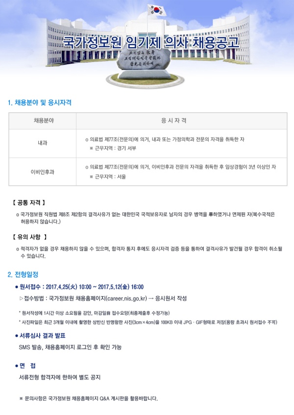 [국정원채용안내] 2017년도 임기제 의사(내과, 이비인후과) 채용 공고 [원서접수:2017.4.25~2017.5.12]