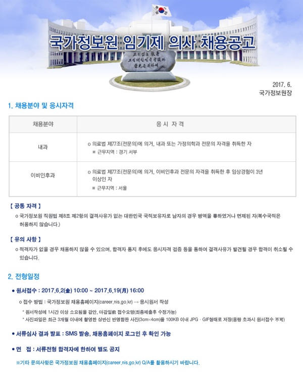 [국정원채용안내] 2017년도 임기제 의사 채용공고 [원서접수:2017.6.2(금) 10:00~2017.6.19(월) 16:00]