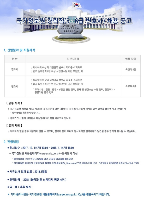 [국정원채용안내] 국가정보원 경력직(5ㆍ6급 변호사) 채용 공고 [원서접수:2017.12.11(월) 10:00~2018.01.01(월) 16:00]