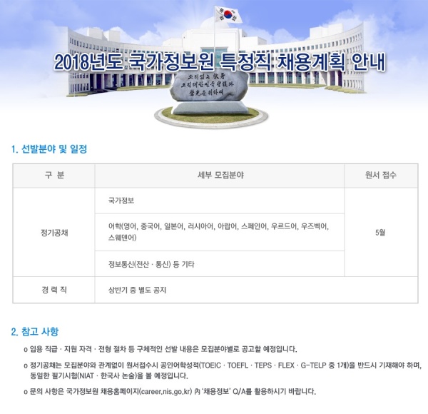 [국정원채용안내] 2018년도 국가정보원 특정직 채용 안내[원서접수:2018.01.30(화) ~ 2018.02.28(수)]