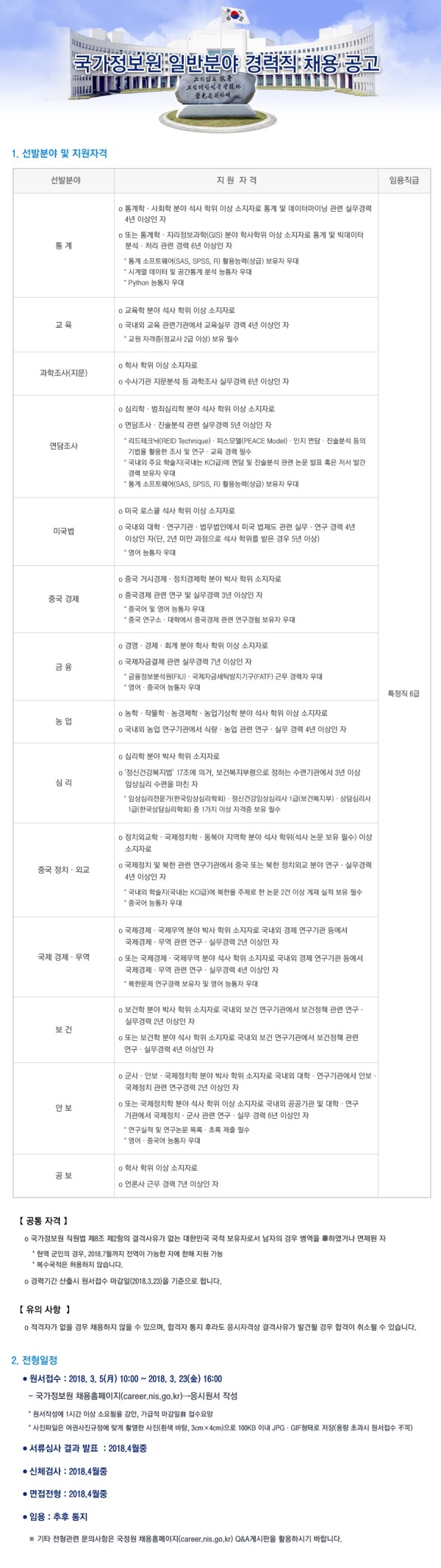 [국정원채용안내] 2018년도 국가정보원 일반직 채용 공고[원서접수:2018.03.5(월) ~ 2018.03.23(금)]