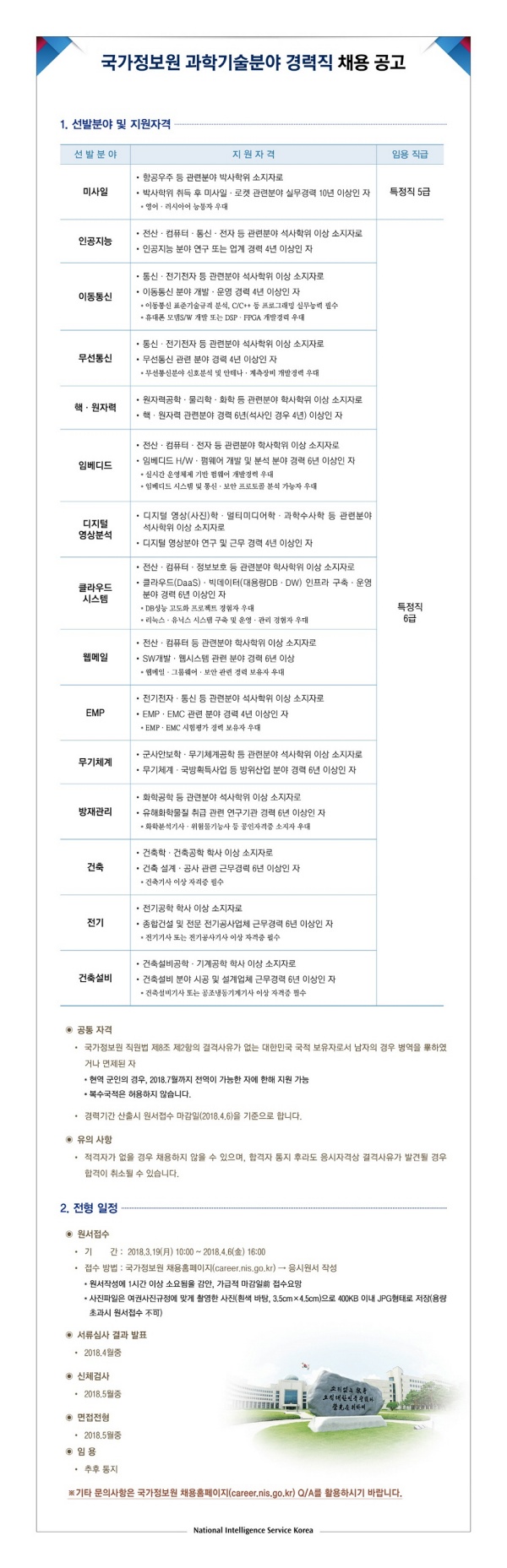 [국정원채용]2018년도 국가정보원 과학기술분야 경력직 채용 공고[원서접수:2018.03.19(월)~04.06(금)]