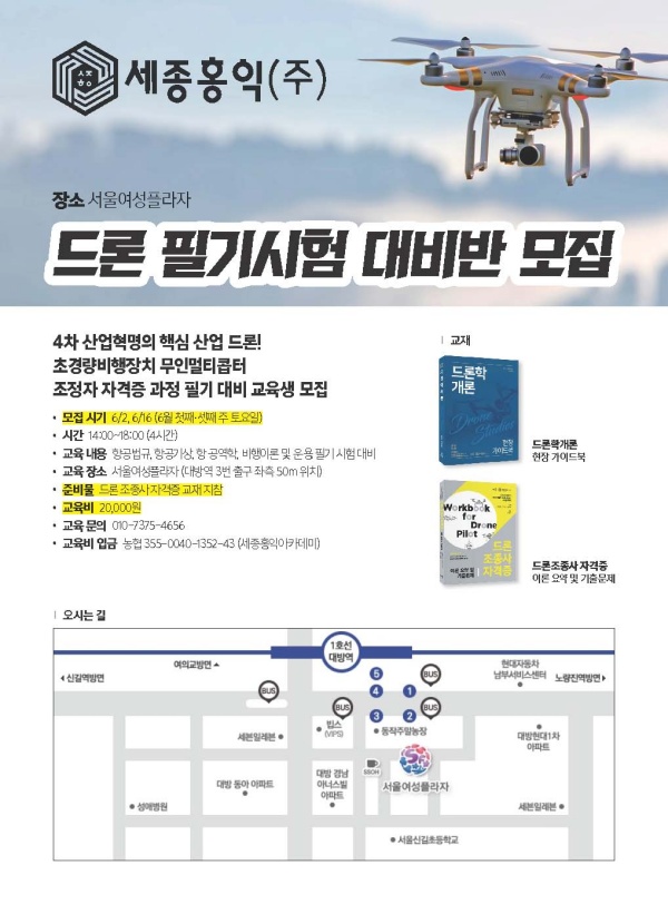 따라서 세종홍익은 일반인뿐만아니라 군인, 공무원, 대학생 등의 드론 조종사 자격증 시험 준비에 도움을 제공하고자 드론 필기시험 대비반을 운영하고 있다. 상세내용은 아래와 같이 서울여성플라자에서 저자 직강으로 강의가 진행될 예정(6월 2일, 6월 16일)이다.