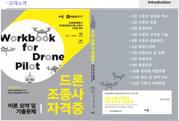 이에 드론 조종사 자격증 취득에 도움이 되고자 드론조종사 자격증 이론요약 및 기출문제집을 시중에 내놓게 되었다. 또한 드론학개론 이론책도함께 내놓았으며 온라인 이론요약강의 및 문제풀이 강의도 함께 진행하고 있다.