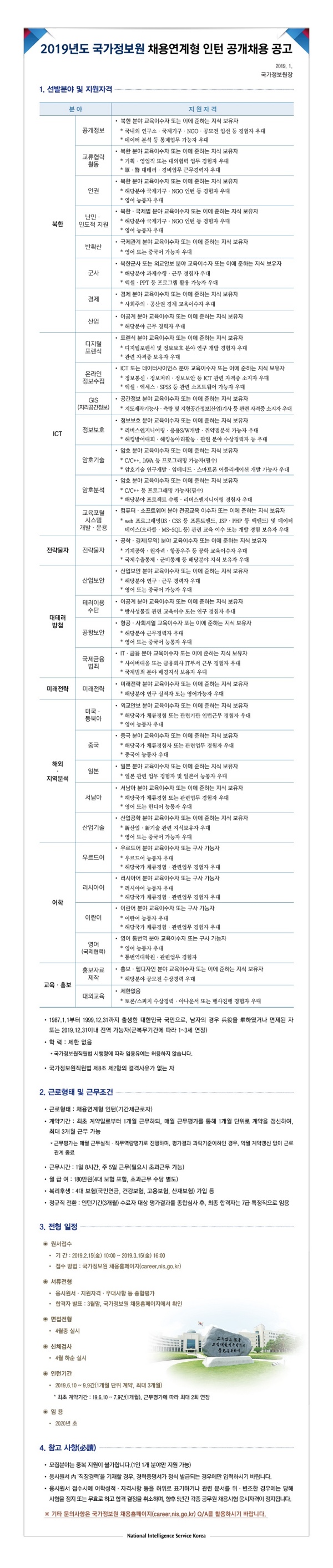 [국정원채용정보]2019년도 채용연계형 인턴 공개채용 공고(원서접수 : 2019.2.15~3.15)