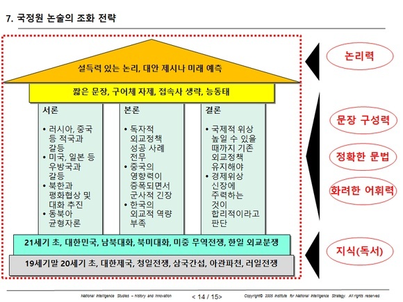 2019년 국정원 논술을 준비하기 위한 조화전략이 필요합니다. 논술준비의 시작은 우선 기본적인 지식을 갖추는 것에서 출발합니다. 지식을 갖추기 위해서는 다양한 주제에 관한 책을 읽을 필요가 있습니다. 또한 서론, 본론, 결론 등이 구성요건에 적합하고 논리적인 글을 쓰려면 문장구성력, 정확한 문법, 화려한 어휘력을 확보하고 있어야 합니다.