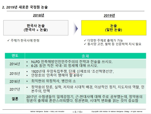 2019년부터 국정원 논술이 기존이 '한국사 논술'에서 '논술'로 변경된다. 논술의 주제가 한국사에서 다양한 소재로 바뀐다는 의미이다. 그동한 국정원 수험생들은 한국사에 대해서만 주로 공부했지만 이제는 동서양 역사, 문화, 사회, 과학기술 등에 대해서도 학습해야 한다.