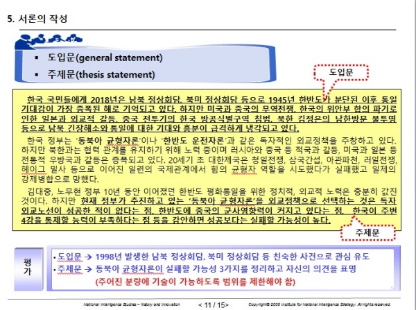 한편 주제문은 현재 정부가 추진하고 있는 동북아 균형자론 혹은 한반도 운전자론 외교정책이 실패할 가능성과 그 이유를 포함하고 있다. 주제문은 본론을 이끌어갈 나침반의 역할을 담당한다. 주제문의 내용에 따라 본론1, 본론2, 본론3을 전개하기 때문이다. 서문의 내용과 평가를 정리하면 다음과 같다.