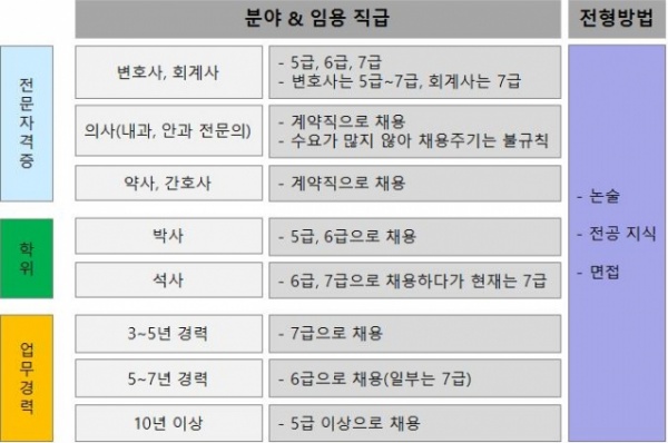 3~5년 경력직원은 7급, 5~7년 경력직원은 6급, 10년 이상은 5급으로 채용하는 것이 일반적이다. 하지만 5년 이상 경력자라고 해서 모두 6급으로 채용하는 것은 아니고 7급으로 채용하기도 한다.