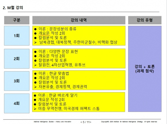 국정원 논술강의는 6개월 과정으로 구성돼 있다. 처음 2개월은 기초과정, 다음 2개월은 심화과정, 마지막 2개월은 실습과정이다. 기초과정 2개월은 틀리기 쉬운 국어문법부터 시작하는 이론과 한국 사회의 유명인사들이 언론에 기고한 오피니언 칼럼을 분석이 핵심이다. 이들 칼럼을 분석해 개요문과 서론 작성 실습이 진행된다.