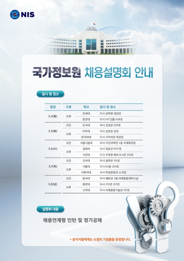 [국정원채용정보]국가정보원 수도권 대학 대상 채용설명회 일정 안내