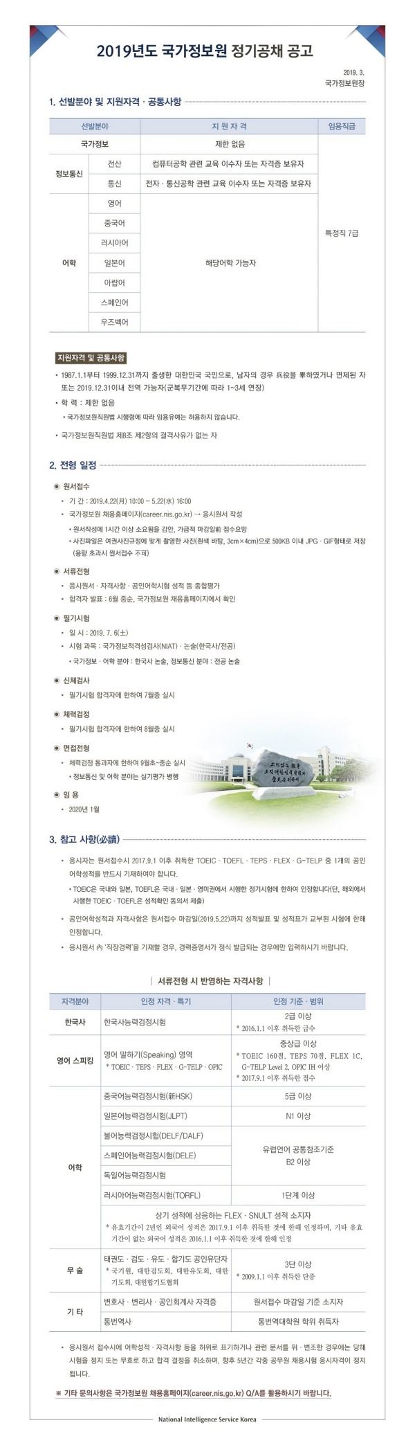 [국정원채용정보]2019년 국가정보원 정기공채 공고(원서접수:2019.4.22(월) 10:00~5.22(수) 16:00, 필기시험:7.6(토))