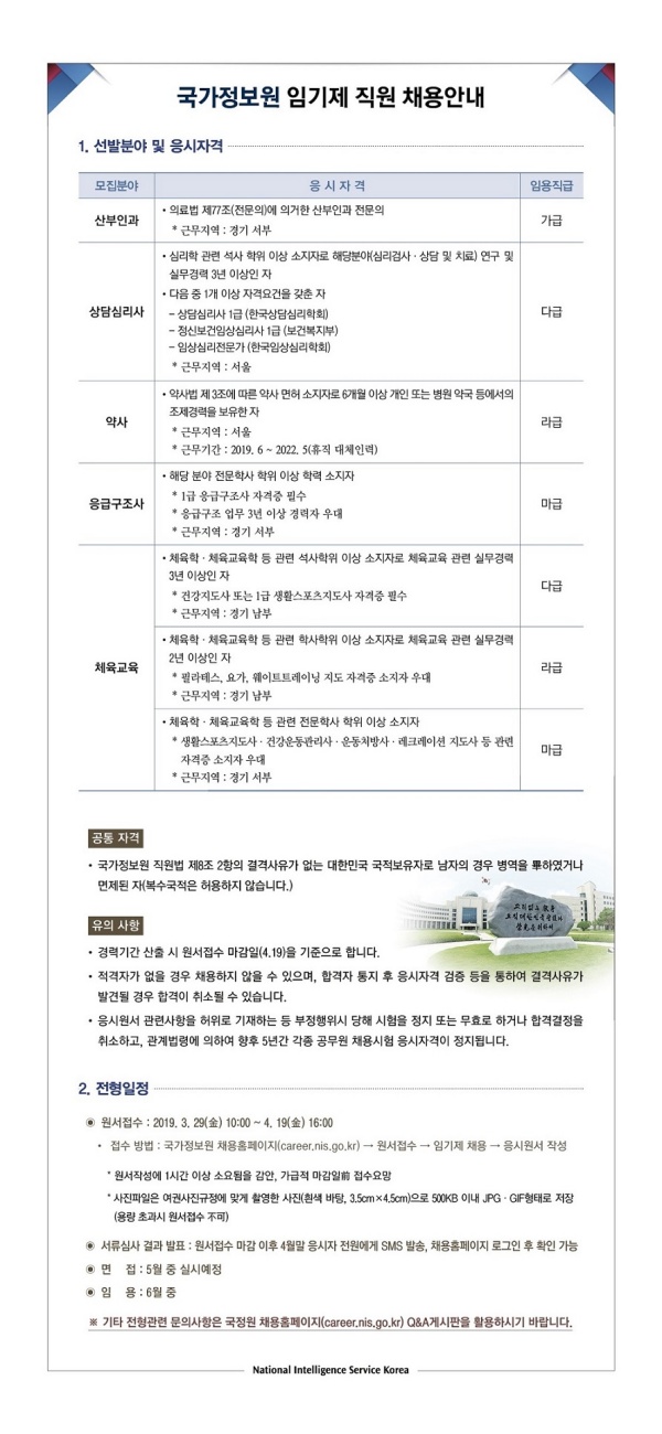 [국정원채용정보] 2019년도 국가정보원 임기제 채용 공고 (2019.3.29(금) 10:00~4.19(금) 16:00)