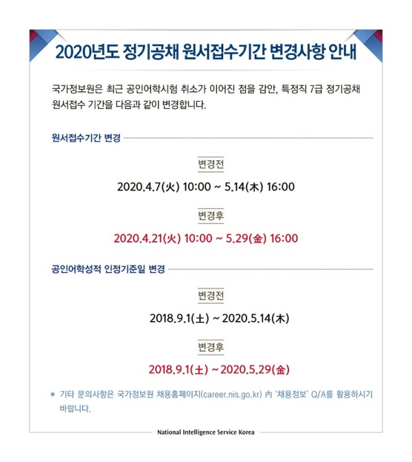 [국정원 채용 정보]2020년도 정기공채 원서접수기간(공인어학성적 인정기준일) 변경사항 안내