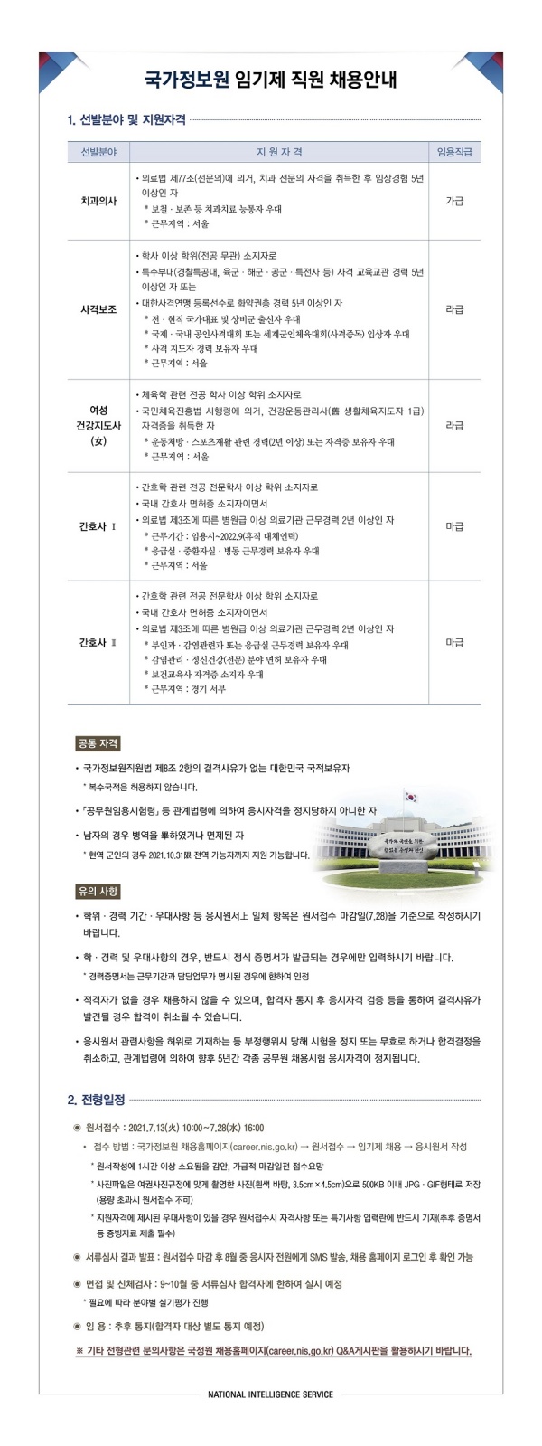 [국정원 채용 정보] 2021년도 국가정보원 임기제 직원 채용 공고(2021-07-13 ~ 2021-07-28)
