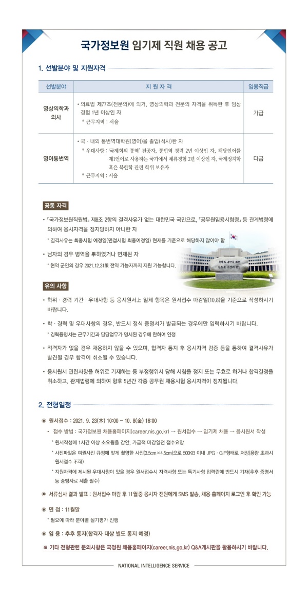 [국정원 채용 정보] 국가정보원 임기제 채용 공고(2021-09-23 ~ 2021-10-08)