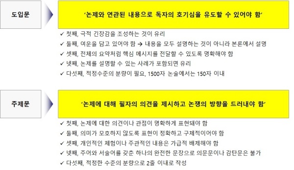 우선 도입문은 독자 혹은 평가자에게 필자가 논제를 충분히 이해했으며 논제에 대해 명확한 주장을 펼칠 수 있다는 확신을 심어줄 수 있도록 작성해야 한다. 5가지 주의사항을 정리해보면 다음과 같다.
