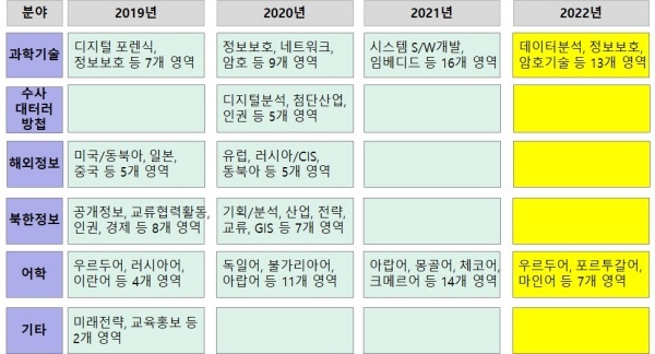 셋째, 전통적으로 강세를 보였던 북한과 수사∙대테러∙방첩, 해외정보 등의 분야는 2021년과 2022년 모두 채용하지 않았다. 7급 정기공채나 경력채용 등을 통해 필요한 인재를 확보할 수 있다는 자신감도 작용했을 것으로 판단된다. 특히 수사∙대테러∙방첩은 2023년말부로 대공수사권을 경찰로 이관하기 때문에 인력수요가 제한적이다.