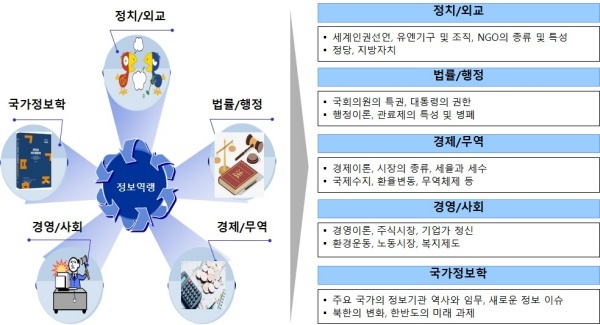 NIAT의 세부 과목인 정보역량은 크게 정치/외교, 법률/행정, 경제/무역, 금융/사회, 국가정보학 등 5가지 영역으로 구성돼 있다. 영역별 출제 내용을 간략하게 정리하면 다음과 같다.
