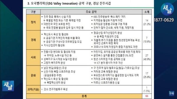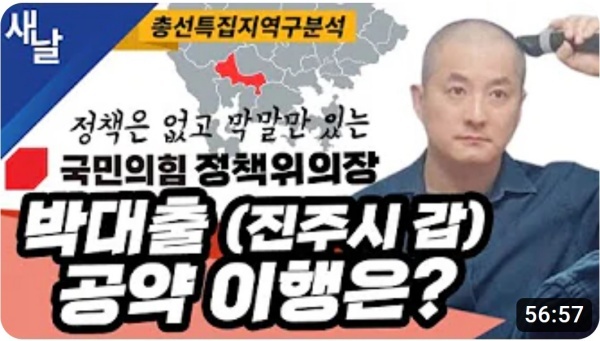지난 9월 19일(화요일) 새날 유튜브 방송에서는 2020년 21대 국회의원 선거에서 당선된 경남 진주시갑 박대출 의원이 제시한 선거공약을 평가했다.