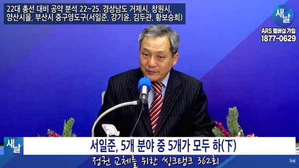 12월26일(화요일) 새날 유튜브 방송은 2020년 21대 국회의원 선거에서 당선된 경상남도 거제시 서일준 의원, 창원시 성산구 강기윤 의원, 양산시을 김두관 의원, 부산광역시 중구·영도구 황보승희 의원이 제시한 선거공약을 평가했다.