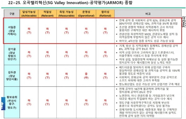 서일준 의원이 제시한 118개 공약은 △달성가능성 △적절성 △측정가능성 △운영성 △합리성 측면에서 모든 영역에서 최하인 하(下) 평점을 받았다.