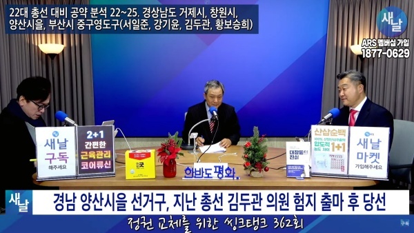 12월26일(화요일) 새날 유튜브 방송은 2020년 21대 국회의원 선거에서 당선된 경상남도 거제시 서일준 의원, 창원시 성산구 강기윤 의원, 양산시을 김두관 의원, 부산광역시 중구·영도구 황보승희 의원이 제시한 선거공약을 평가했다. 이번에는 경상남도 양산시을 김두관 의원이 제시한 선거공약 평가 내용을 소개한다.