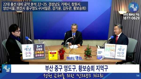 12월26일(화요일) 새날 유튜브 방송은 2020년 21대 국회의원 선거에서 당선된 경상남도 거제시 서일준 의원, 창원시 성산구 강기윤 의원, 양산시을 김두관 의원, 부산광역시 중구·영도구 황보승희 의원이 제시한 선거공약을 평가했다. 이번에는 부산광역시 중구·영도구 황보승희 의원이 제시한 선거공약 평가 내용을 소개한다.