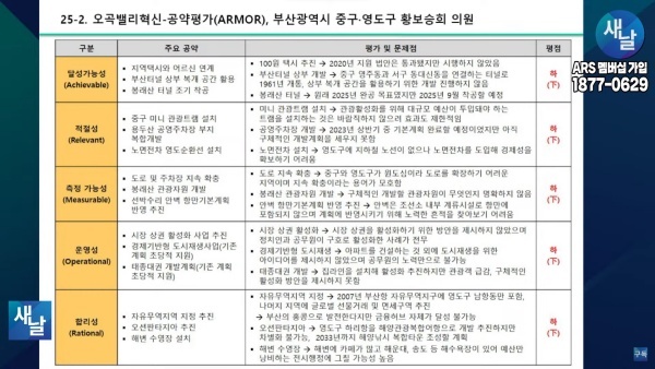[기획-국회의원 공약 평가] 25. 새날 방송, 부산광역시 중구·영도구 황보승희 의원···달성가능성 등 5개 부문 모두 하(下)