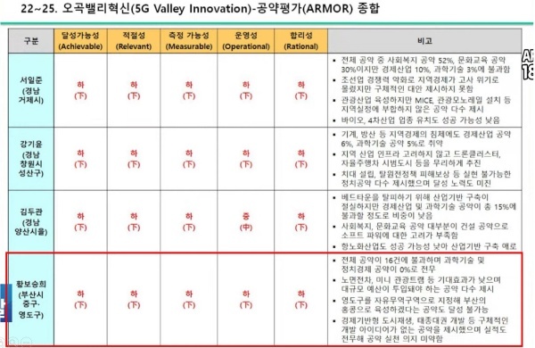 황보승희 의원이 제시한 16개 공약은 △달성가능성 △적절성 △측정가능성 △운영성 △합리성 등 5개 영역 모두에서 최하인 하(下) 평점을 받았다.