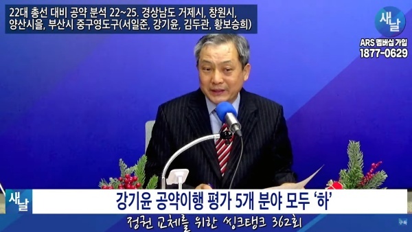 12월26일(화요일) 새날 유튜브 방송은 2020년 21대 국회의원 선거에서 당선된 경상남도 거제시 서일준 의원, 창원시 성산구 강기윤 의원, 양산시을 김두관 의원, 부산광역시 중구·영도구 황보승희 의원이 제시한 선거공약을 평가했다. 이번에는 창원시 성산구 강기윤 의원이 제시한 선거공약 평가 내용을 소개한다.