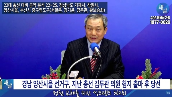 12월26일(화요일) 새날 유튜브 방송은 2020년 21대 국회의원 선거에서 당선된 경상남도 거제시 서일준 의원, 창원시 성산구 강기윤 의원, 양산시을 김두관 의원, 부산광역시 중구·영도구 황보승희 의원이 제시한 선거공약을 평가했다. 이번에는 경상남도 양산시을 김두관 의원이 제시한 선거공약 평가 내용을 소개한다.