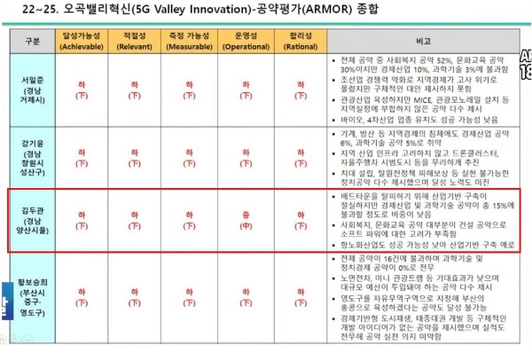 김두관 의원이 제시한 65개 공약은 △운영성 측면에서 중(中)을 획득해 측정 가능성 측면에서 중(中)을 받은 광주광역시 서구을 양향자 의원과 마찬가지로 1개 분야만 중(中)이다. 나머지 △달성가능성 △적절성 △측정가능성 △합리성 등 4개 영역은 최하인 하(下) 평점을 받았다.