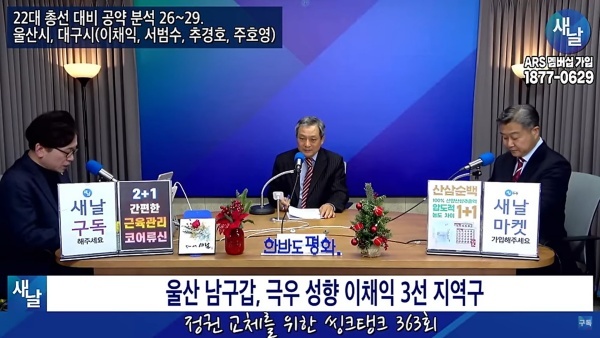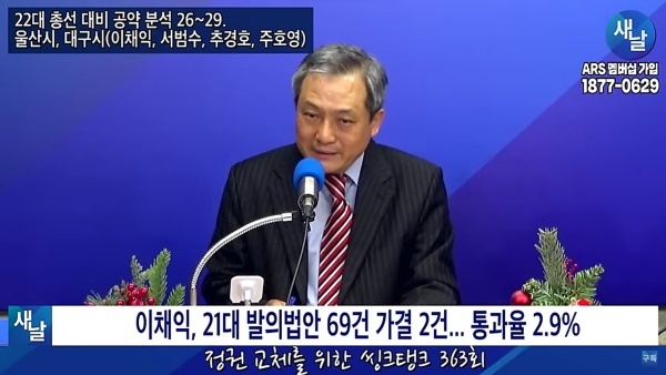 2024년01월06일(토요일) 새날 유튜브 방송은 2020년 21대 국회의원 선거에서 당선된 울산광역시 남구갑 이채익, 울주군 서범수, 대구광역시 달성군 추경호, 수성구갑 주호영 의원이 제시한 선거공약을 평가했다. 이번에는 울산광역시 남구갑 이채익 의원이 제시한 선거공약 평가 내용을 소개한다.