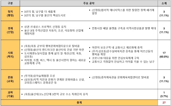21대에 제시한 27개 공약은 정치(행정)(3)·경제(산업)(3)·사회(복지)(17)·문화(교육)(3)·과학(기술)(1)로 구성됐으며 사회(복지) 공약이 63.0%를 차지했다. 다음으로 △문화(교육) 공약 11.1% △경제(산업) 공약 11.1%이며 △정치(행정) 공약 11.1%이며 △과학(기술) 공약 3.7%를 각각 기록했다.