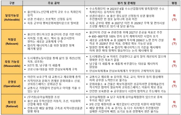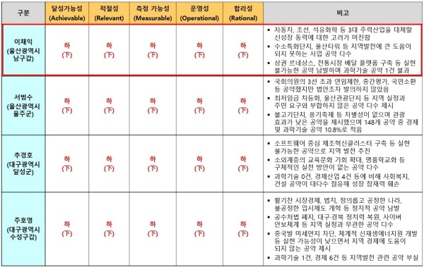 이채익 의원이 제시한 27개 공약은 △달성가능성 △적절성 △측정가능성 △운영성 △합리성 등 5개 영역 모두에서 최하인 하(下) 평점을 받았다.