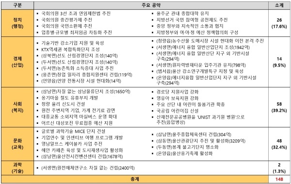 21대에 제시한 148개 공약은 정치(행정)(26)·경제(산업)(14)·사회(복지)(58)·문화(교육)(48)·과학(기술)(2)로 구성됐으며 △사회(복지) 공약이 전체의 39.2%를 차지했다. 다음으로 △문화(교육) 공약 32.4% △정치(행정) 공약 17.6%이며 △경제(산업) 공약 9.5% △과학(기술) 공약 1.3%를 각각 기록했다.