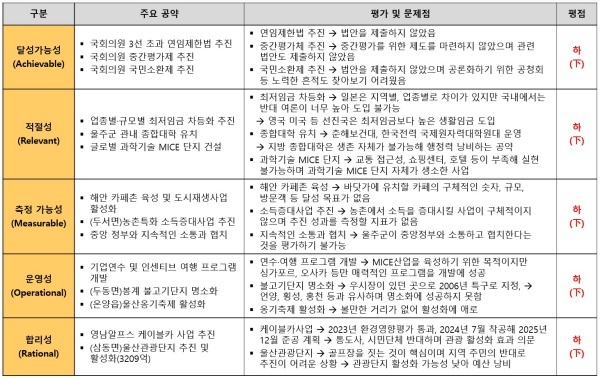 서범수 의원이 제시한 148개 공약은 △달성가능성 △적절성 △측정가능성 △운영성 △합리성 등 5개 영역 모두에서 최하인 하(下) 평점을 받았다.