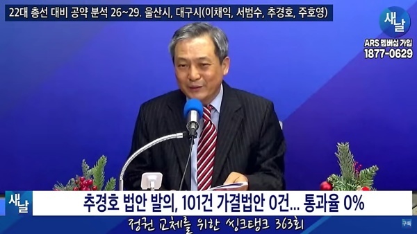 2024년01월06일(토요일) 새날 유튜브 방송은 2020년 21대 국회의원 선거에서 당선된 울산광역시 남구갑 이채익, 울주군 서범수, 대구광역시 달성군 추경호, 수성구갑 주호영 의원이 제시한 선거공약을 평가했다. 이번에는 대구광역시 달성군 추경호 의원이 제시한 선거공약 평가 내용을 소개한다.
