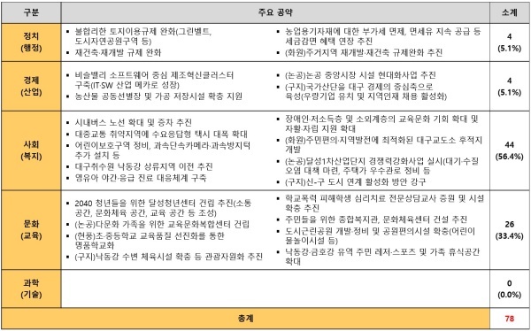 21대에 제시한 78개 공약은 정치(행정)(4)·경제(산업)(4)·사회(복지)(44)·문화(교육)(26)·과학(기술)(0)으로 구성됐으며 사회(복지) 공약이 전체의 56.4%를 차지했다. 다음으로 △문화(교육) 공약 33.4% △경제(산업) 공약은 5.1% △정치(행정) 공약 5.1%‘ △과학(기술) 공약 0.0%를 각각 기록했다.