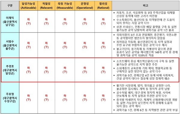 추경호 의원이 제시한 78개 공약은 △달성가능성 △적절성 △측정가능성 △운영성 △합리성 등 5개 영역 모두에서 최하인 하(下) 평점을 받았다.