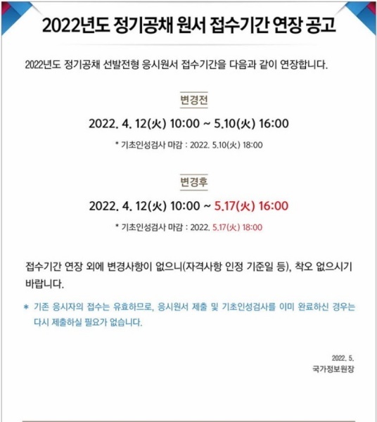 2022년도 국가정보원 정기공채 원서 접수기간 연장 공고