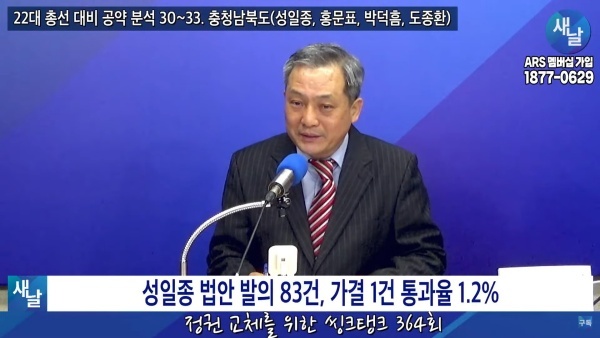 2024년01월09일(화요일) 새날 유튜브 방송은 2020년 21대 국회의원 선거에서 당선된 충청남도 서산시·태안군 성일종 의원이 제시한 선거공약을 평가했다. 평가를 위한 방송에는 푸른나무, 이상구 원장, 민진규 소장(국가정보전략연구소)이 출연했다.