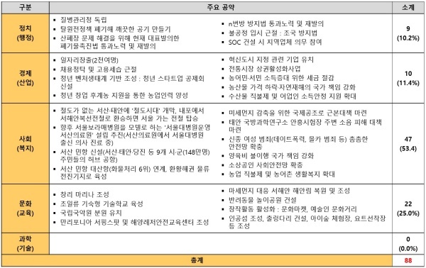 21대 제시한 88개 공약은 정치(행정)(9)·경제(산업)(10)·사회(복지)(47)·문화(교육)(22)·과학(기술)(0)으로 구성됐으며 사회(복지) 공약이 53.4%를 차지했다. 다음으로 △문화(교육) 공약 25.0% △경제(산업) 공약 11.4% △정치(행정) 공약 10.2% △과학(기술) 공약 0.0%를 각각 기록했다.