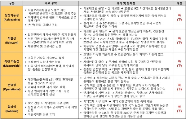 성일종 의원이 제시한 88개 공약은 △달성가능성 △적절성 △측정가능성 △운영성 △합리성 등 5개 영역 모두에서 최하인 하(下) 평점을 받았다.